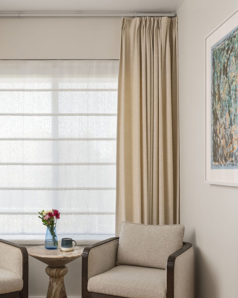 We installed Patti Linen Flat Fold Roman Shades (Cordless, Off White B312) for privacy and light control. Layered over the shades are Jawara Luxury Linen Cotton Curtains (Pleated, Ivory Beige J401-2) mounted on LORA Track Kits. This layered approach: